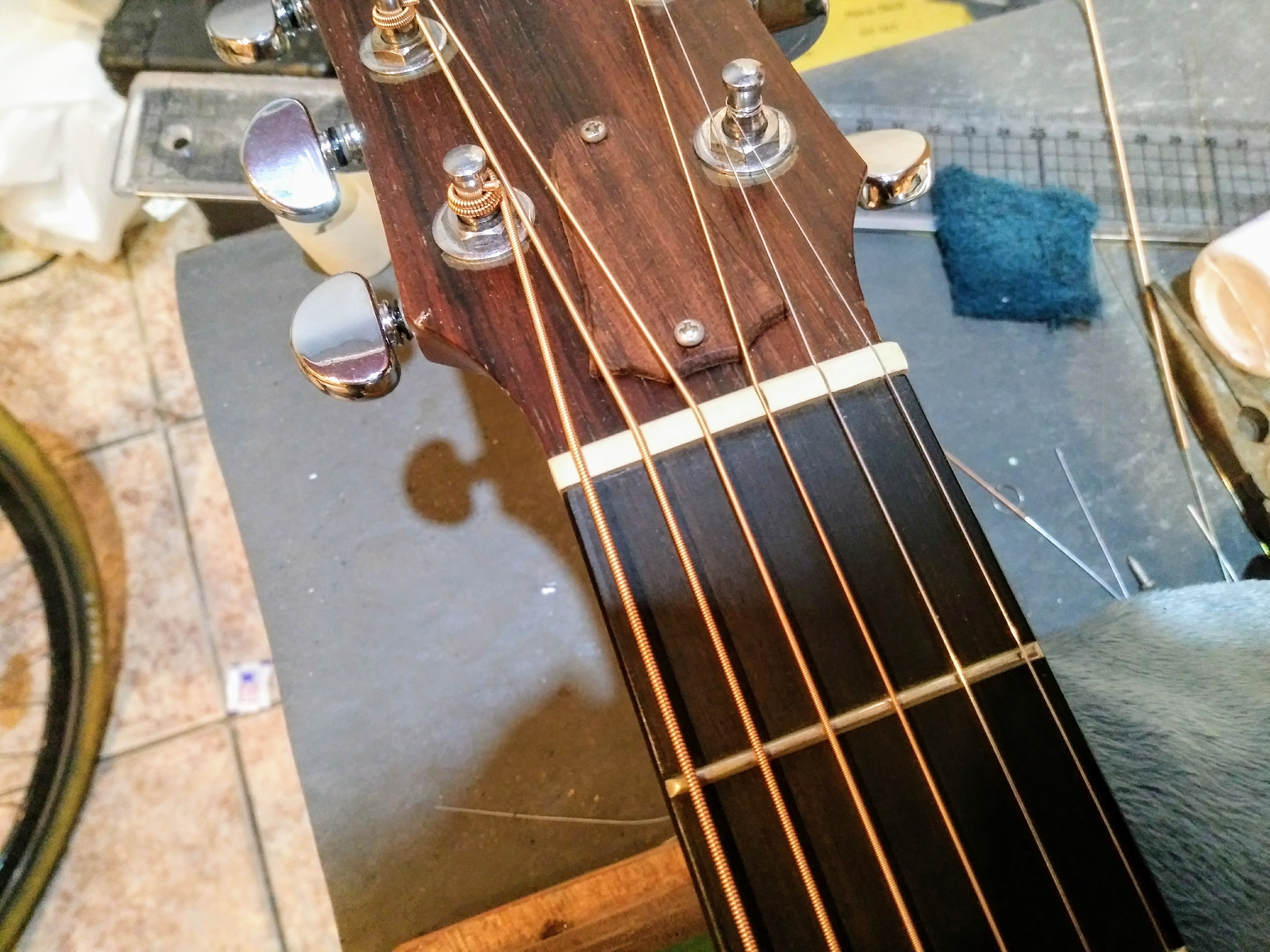 테일러 통기타 너트와 새들을 오일 본 너트와 새들로 교체 작업을 했습니다.