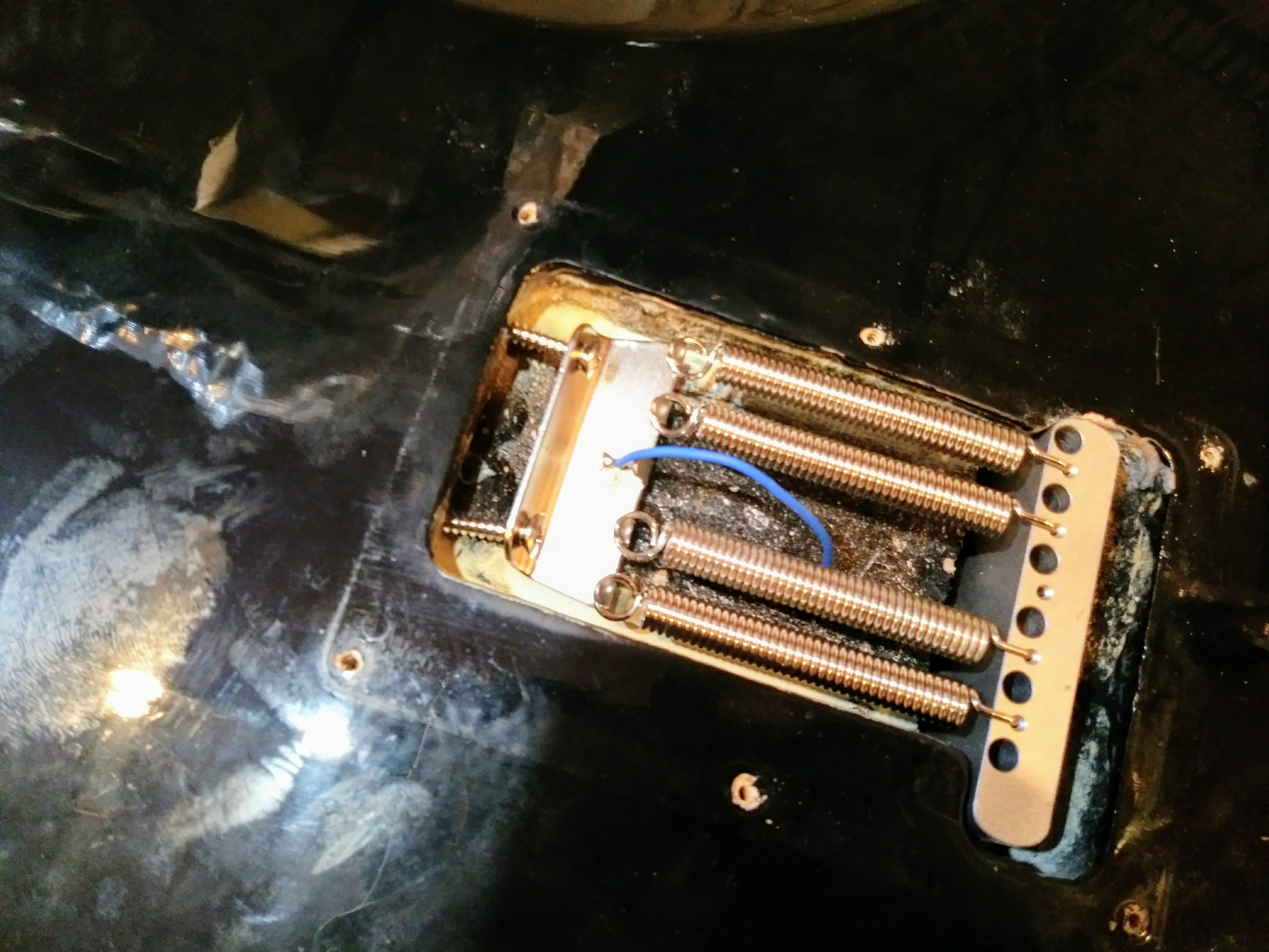 일렉기타 브릿지 교체 일렉기타 브릿지가 파손 되어서 교체 작업을 했습니다. 아래 사진 처럼 브릿지 올라 왔습니다. 이유는 브릿지와 스프링 연결하는 쇠뭉치가 파손 되어서 스프링 당기는 힘을 받지 못해서 생기는 현상 입니다. 교체할 브릿지는 고또 브릿지를 선택 했습니다. 브릿지 제거 하고, 브릿지 장착 한 다음 접지선을 브릿지 기구물 연결 합니다. 작업을 완료 했습니다. 천안어쿠스틱기타, 키튼 기타, Keaton, gotoh Repair Service/리페어 자료실 2020.02.28